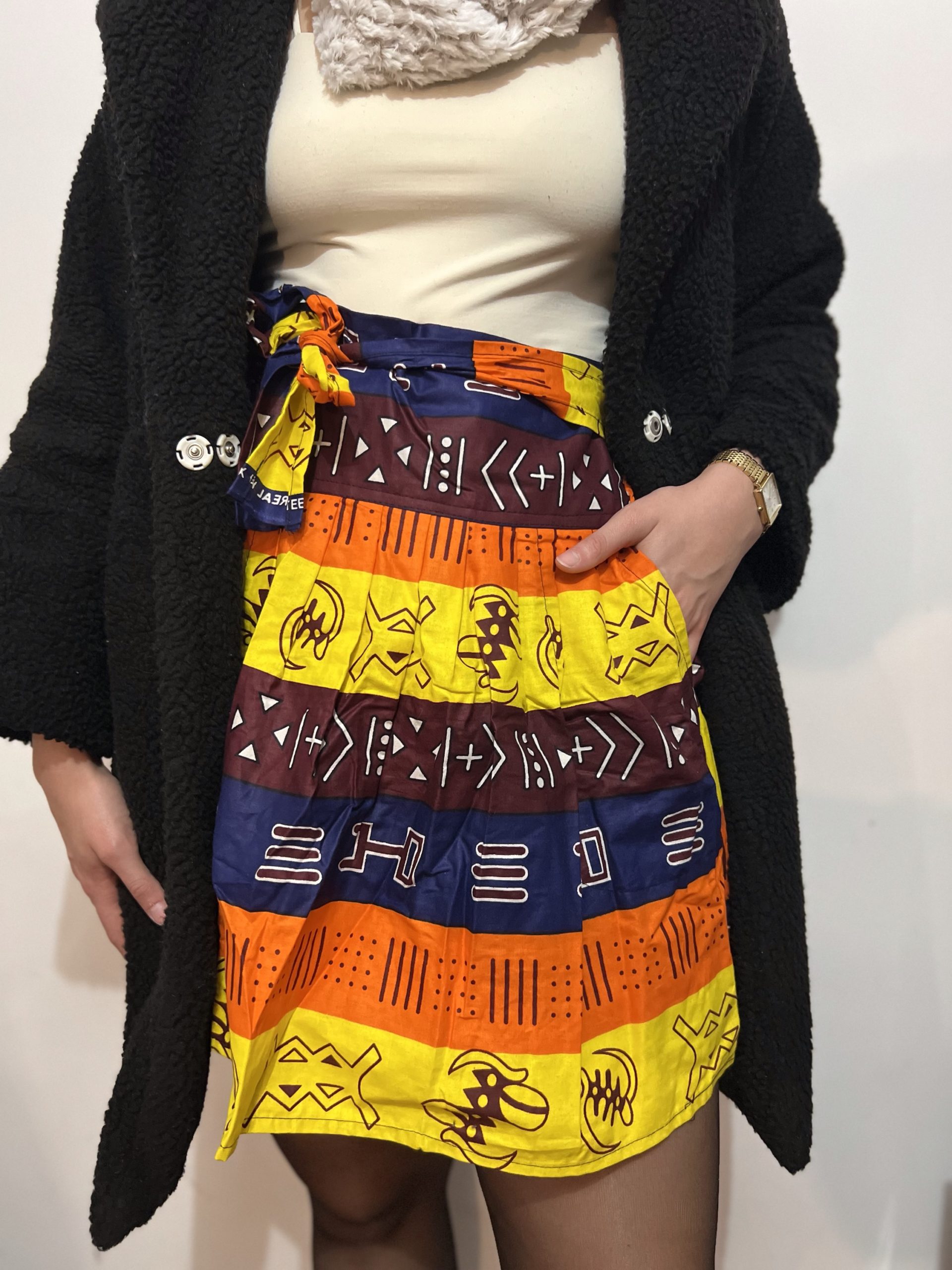 Portez-les avec un collant et des bottes pour affronter le froid en style. Les motifs vibrants en wax apportent une touche d’originalitĂ© Ă  chaque tenue.
